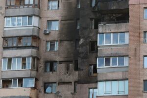 Smoke marks on the facade of a residential building damaged during a Russian drone and missile strike, amid Russia’s attack on Ukraine, in Kyiv, on October 22, 2025.