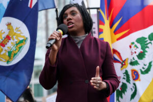 Conservative Party leader Kemi Badenoch speaks during a demonstration near the proposed site of a huge new Chinese embassy at Royal Mint Court in London on Saturday.