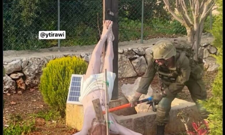 The photo, taken in the predominantly Christian village of Debel, shows the figure of Christ leaning against the cross. The figure appears upside down, removed from the cross. The picture, posted on Sunday, shows an Israeli soldier seemingly hitting the head of the figure with a hammer or ax.